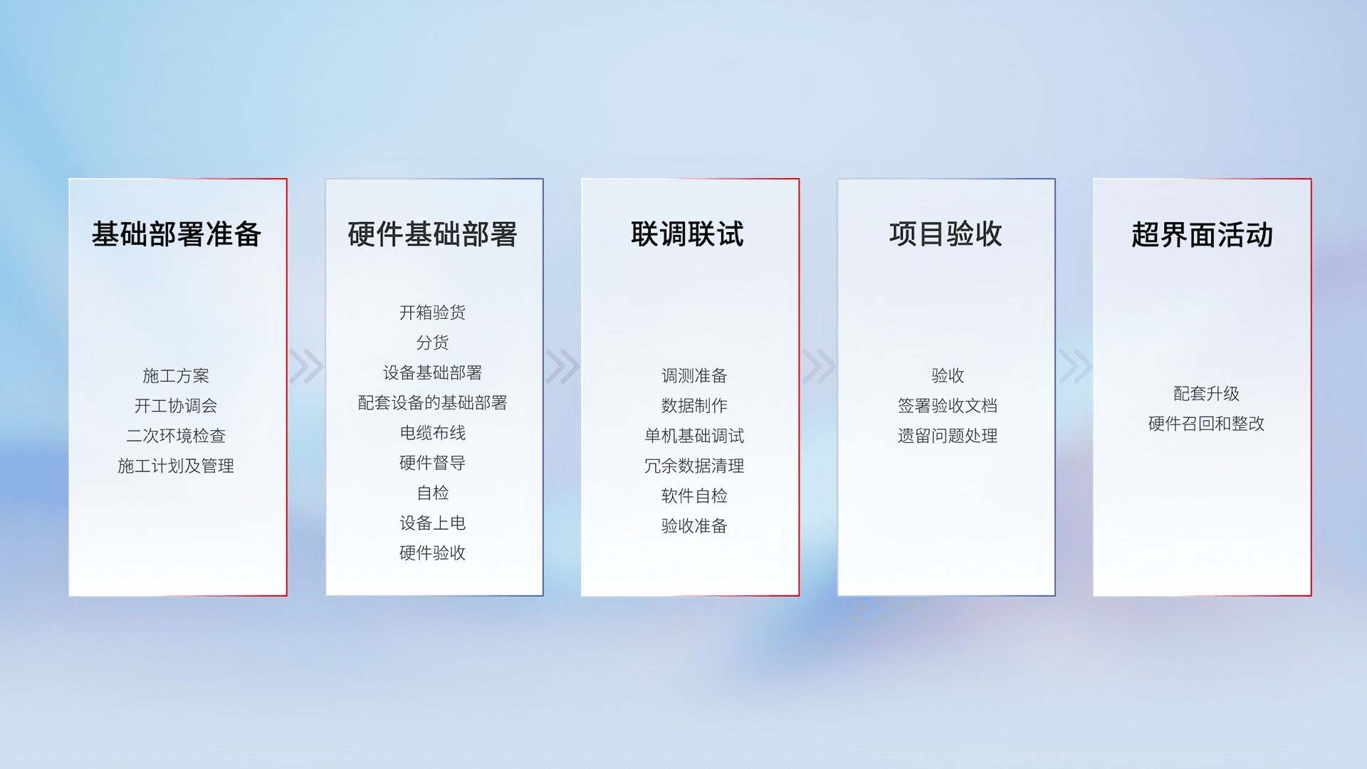 从基础部署准备、、、硬件基础部署、、、、联调联试、、、、项目验收、、越界面活动的全过程可追溯,,,保证施工质量和进度。。